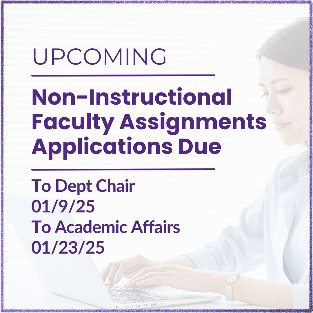 Non-instructional faculty assignments (NIFA) proposals are due to department chairs/directors by January 9, 2026. NIFA are designed to contribute to the professional growth of the faculty, improve teaching and curriculum across the University, and/or enhance scholarship and academic excellence of Tennessee Tech in ways that cannot be accomplished under constraints of regular workload assignments. Applicants are responsible for submitting proposals to Academic Affairs by January 23, 2025. Visit the website additional details.