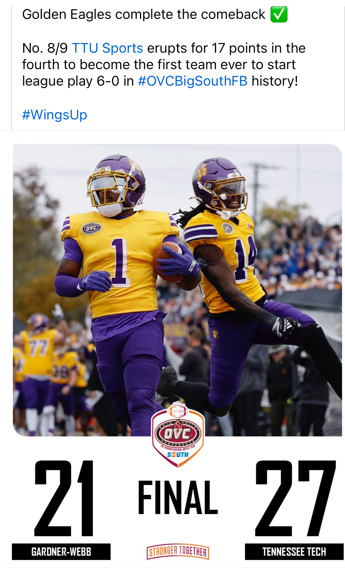 The No. 8/9 Tennessee Tech Golden Eagles erupted for 17 points in the fourth quarter to secure a 27–21 victory over Gardner-Webb. With the win, Tech becomes the first team in OVC/Big South Football Association history to open league play with a 6–0 record.