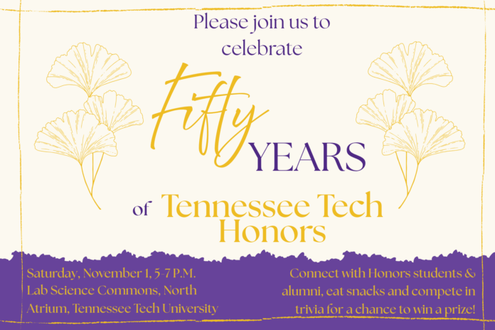 50th Anniversary of Tech Honors! 17 FacebookTwitterPinterestWhatsApp Join us on Saturday, November 1st to celebrate 50 years of the Tennessee Tech Honors Program! Current students are invited to attend and connect with alumni. The celebration will take place from 5-7 PM at the Lab Science Commons North Atrium.