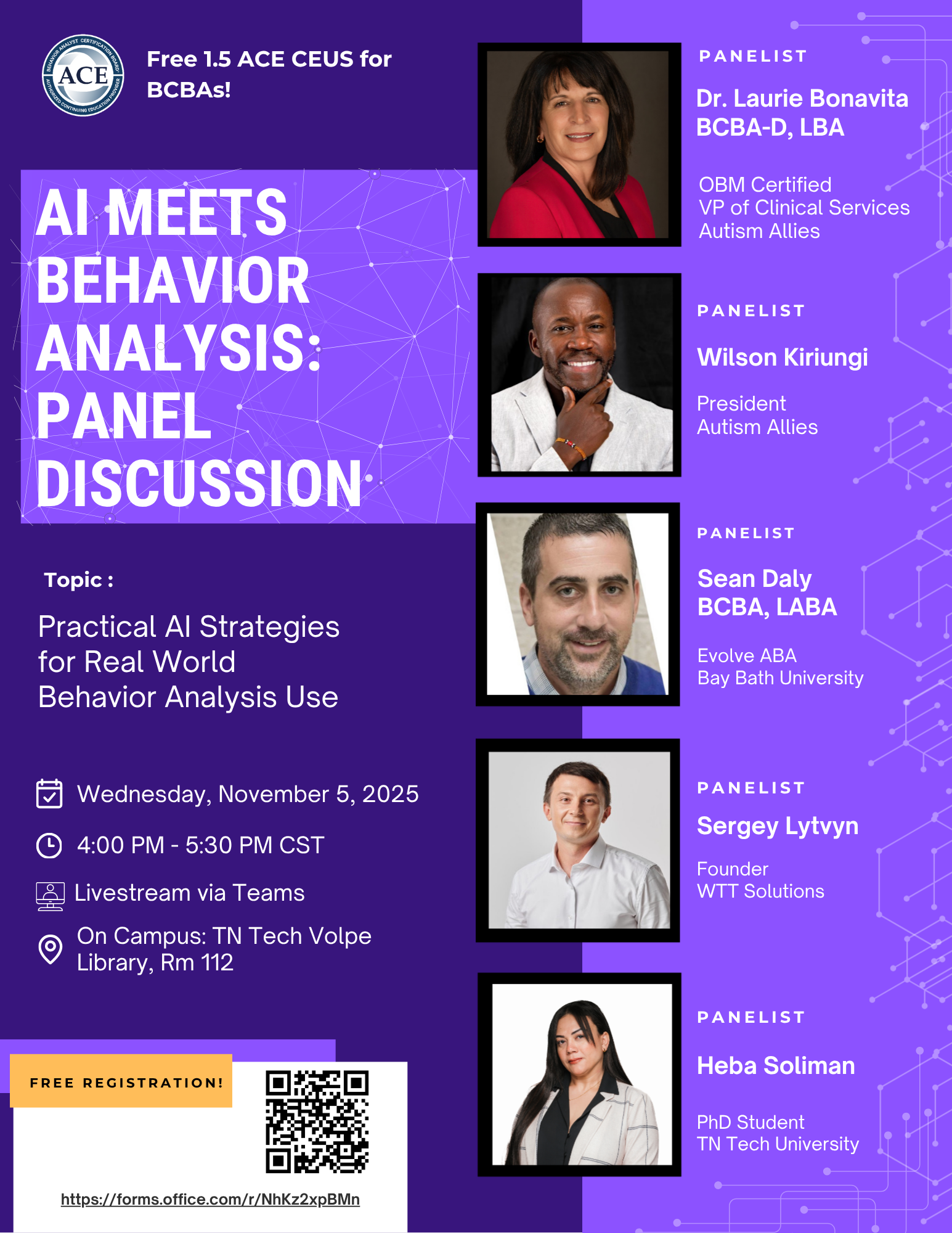 Join us for an exciting expert panel discussion on AI in Behavior Analysis! The ABA Club is hosting this free event on Wednesday, November 5th, at 4:00 PM in Volpe Library Room 112, with a livestream option available.