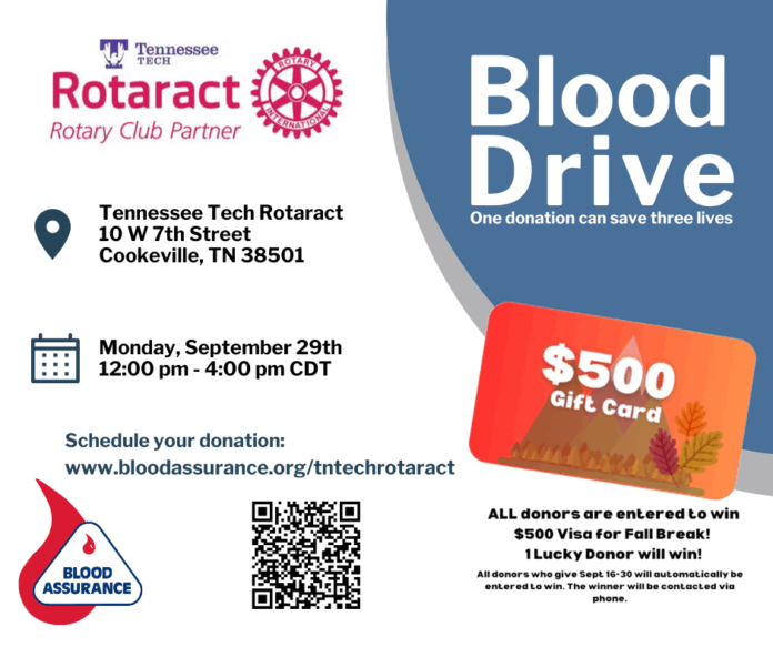 Join Rotaract and Blood Assurance of Cookeville TODAY on the Quad! From 12:00pm – 4:00pm, Rotaract is partnering with Blood Assurance to help the local community and save lives! Every donation saves three lives in our surrounding community and enters the donor into a drawing for a $500 gift card through Blood Assurance! Help Rotaract save the lives of people who give so much to Tennessee Tech and win a gift card for you to spend!