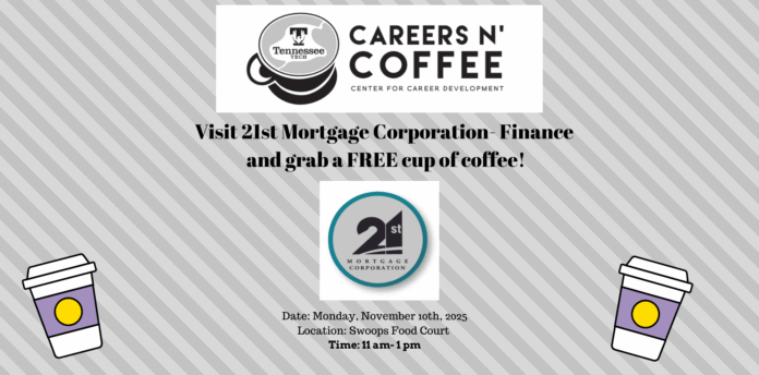 Take a break and enjoy a FREE cup of coffee while speaking with recruiters from 21st Mortgage Corporation on Monday, November 10, at 11 AM in the RUC’s Swoops Food Court.