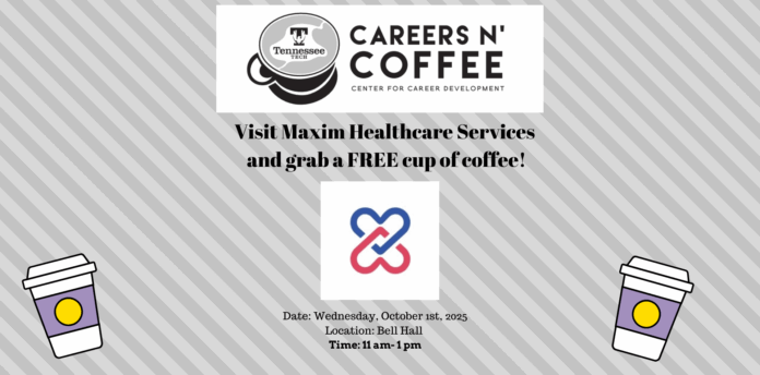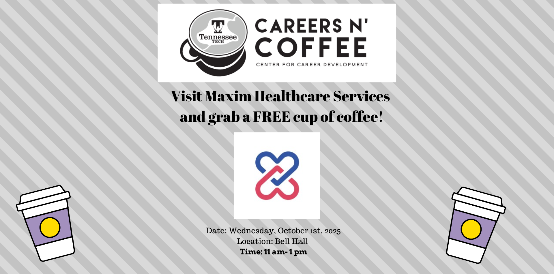 Take a break and enjoy a FREE cup of coffee while speaking with recruiters from Maxim Healthcare Services on Wednesday, October 1, at 11 AM in Bell Hall.