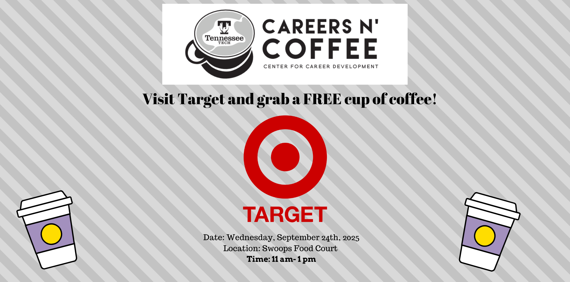 Take a break and enjoy a FREE cup of coffee while speaking with recruiters from Target on Wednesday, September 24, at 11 AM in the RUC’s Swoops Food Court.