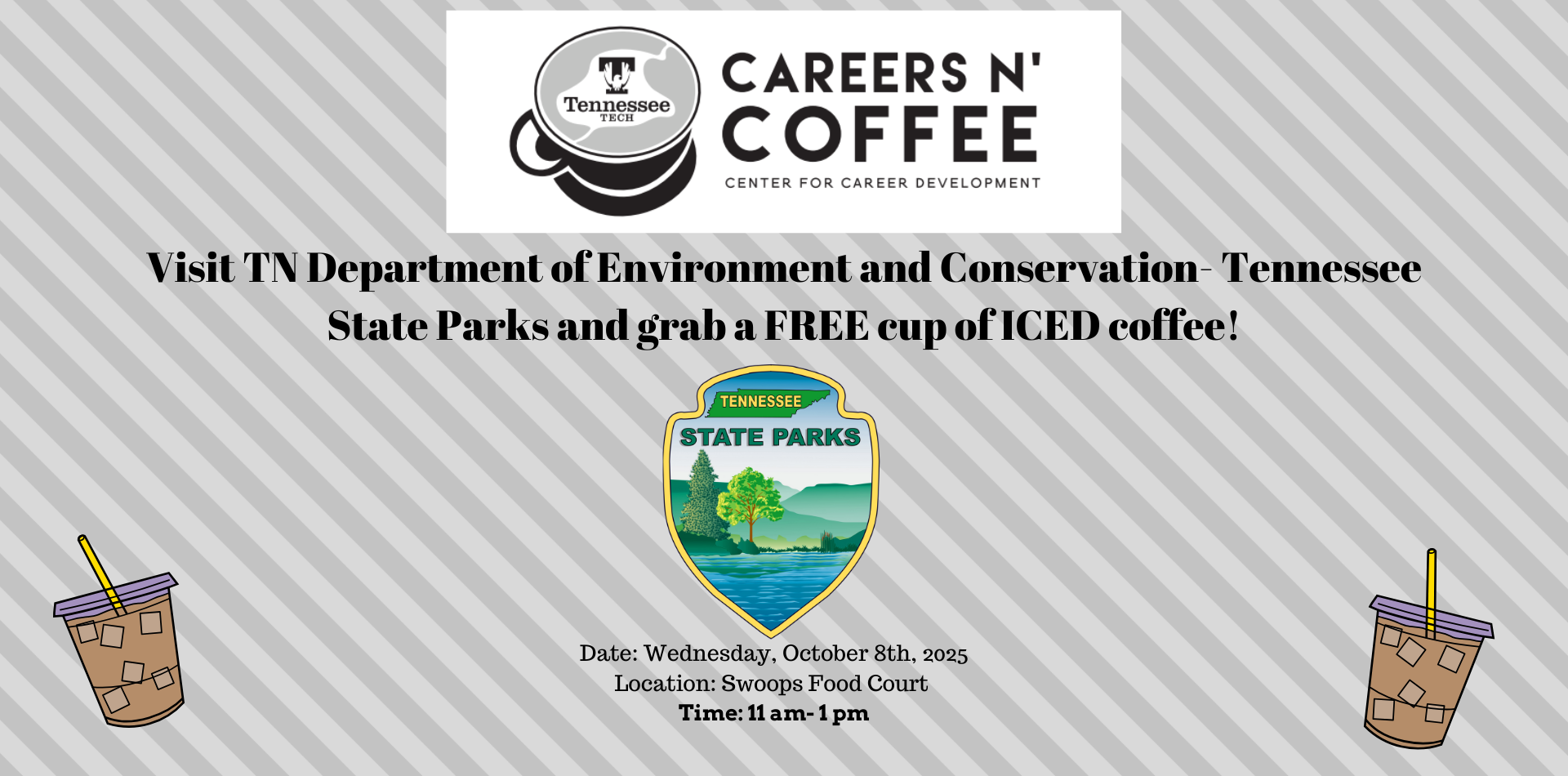 Take a break and enjoy a FREE cup of iced coffee while speaking with recruiters from TDEC on Wednesday, October 8, at 11 AM in the RUC’s Swoops Food Court.