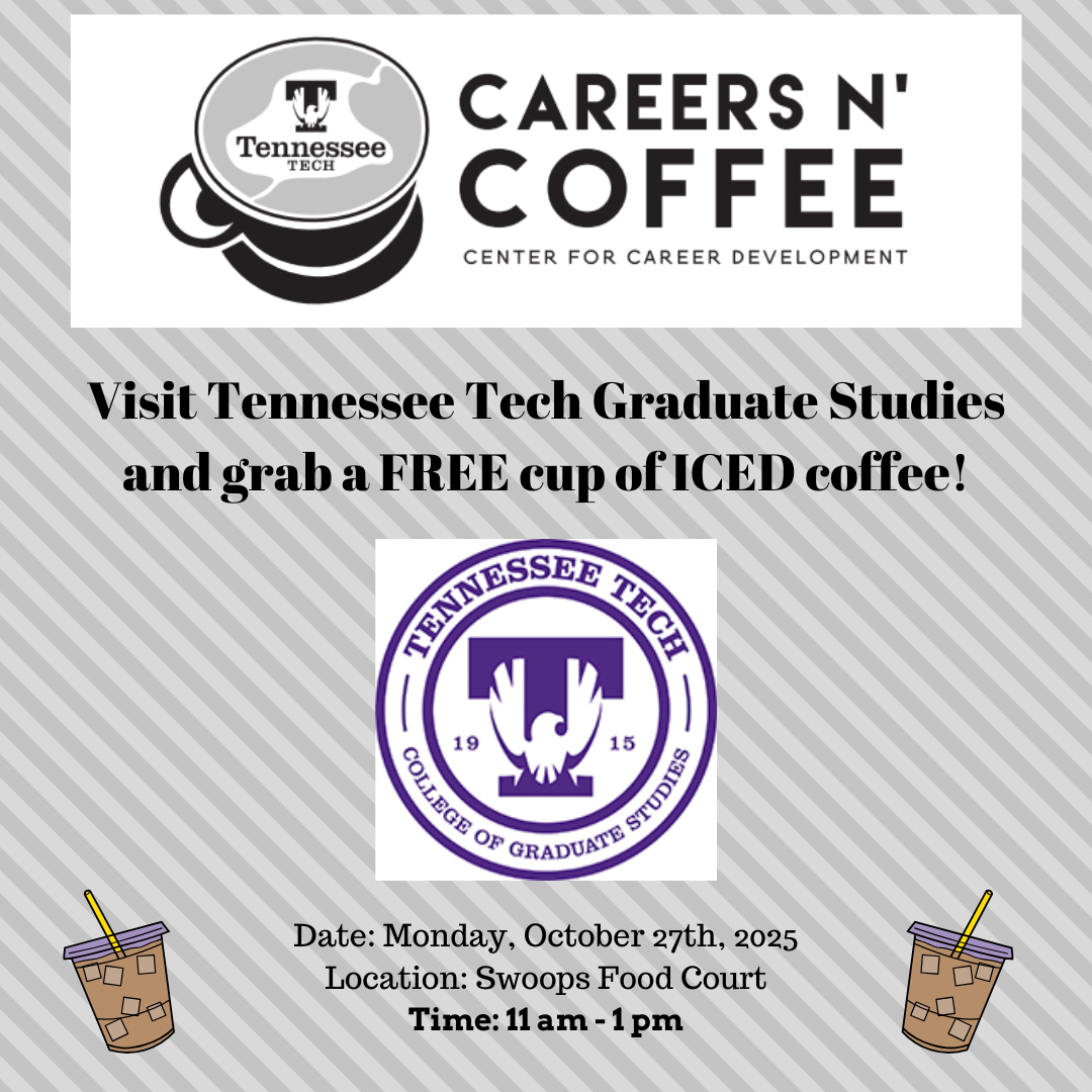 Take a break and enjoy a FREE cup of coffee while speaking with recruiters from TN Tech Graduate Studies on Monday, October 27, at 11 AM in the RUC’s Swoops Food Court.