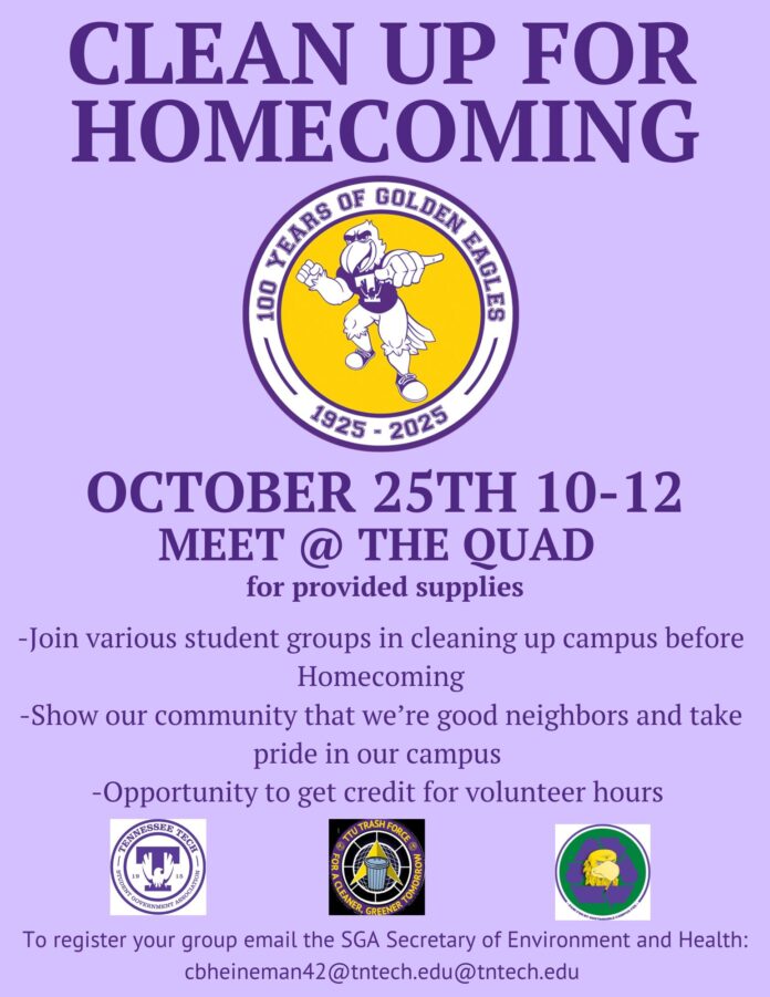 Show our community that we’re good neighbors and take pride in our campus. Join the Office of Sustainability, Trash Force, and SGA to get the campus clean for our alumni. Anyone seeking to join the event should email the student secretary of environment and health cbheineman42@tntech.edu for more information. Students, faculty, and student orgs are all invited to join us on October 25th from 10am-12 on the main quad. in front of Jere Whitson.