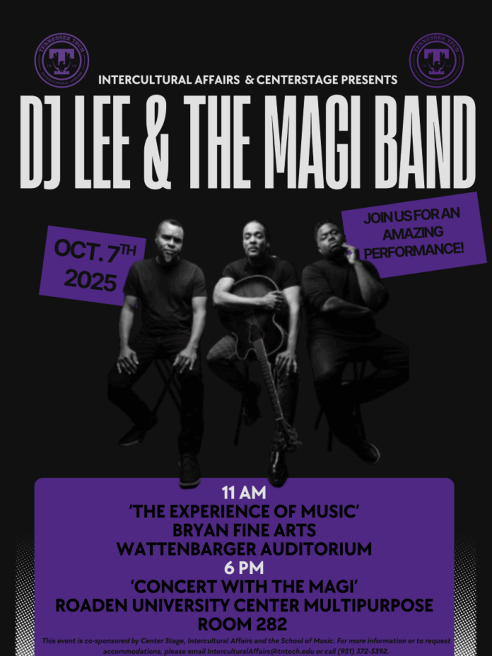 Join Center Stage, Intercultural Affairs, and the School of Music for an exciting day with DJ Lee & The MAGI Band on Tuesday, October 7th. Experience two dynamic performances: “The Experience of Music” at 11:00 AM in Bryan Fine Arts Wattenbarger Auditorium, and a high-energy Live Concert at 6:00 PM in Roaden University Center Multipurpose Room (RUC 282). Learn more at www.themagimusic.com.