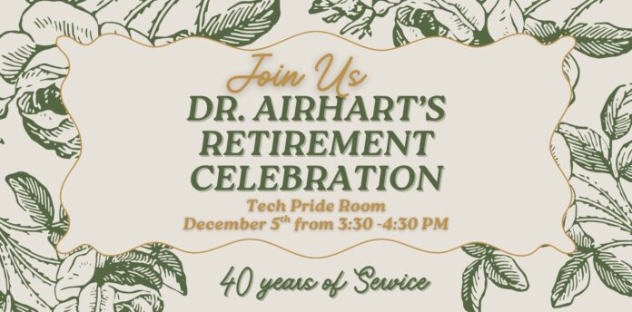 Join us as we honor Dr. Douglas Airhart and celebrate his 40 years of dedicated service to Tennessee Tech University! A retirement reception will be held on Friday, December 5th, from 3:30 to 4:30 p.m. in the Tech Pride Room.