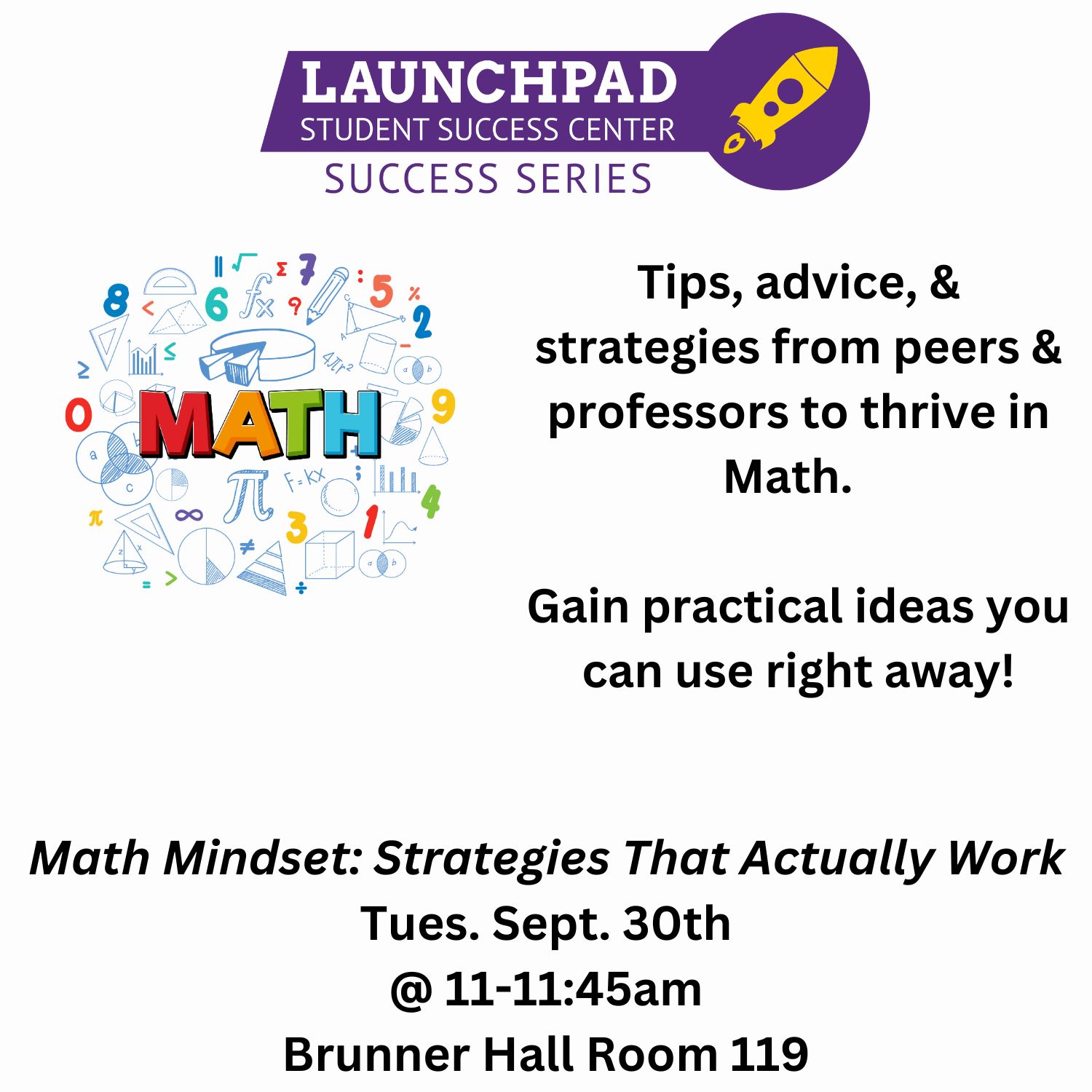 Launchpad Student Success Center & the Math Dept will host “Math Mindset: Strategies That Actually Work” from 11 a.m. to 11:45 a.m., September 30th, in Room 119 in Bruner Hall.