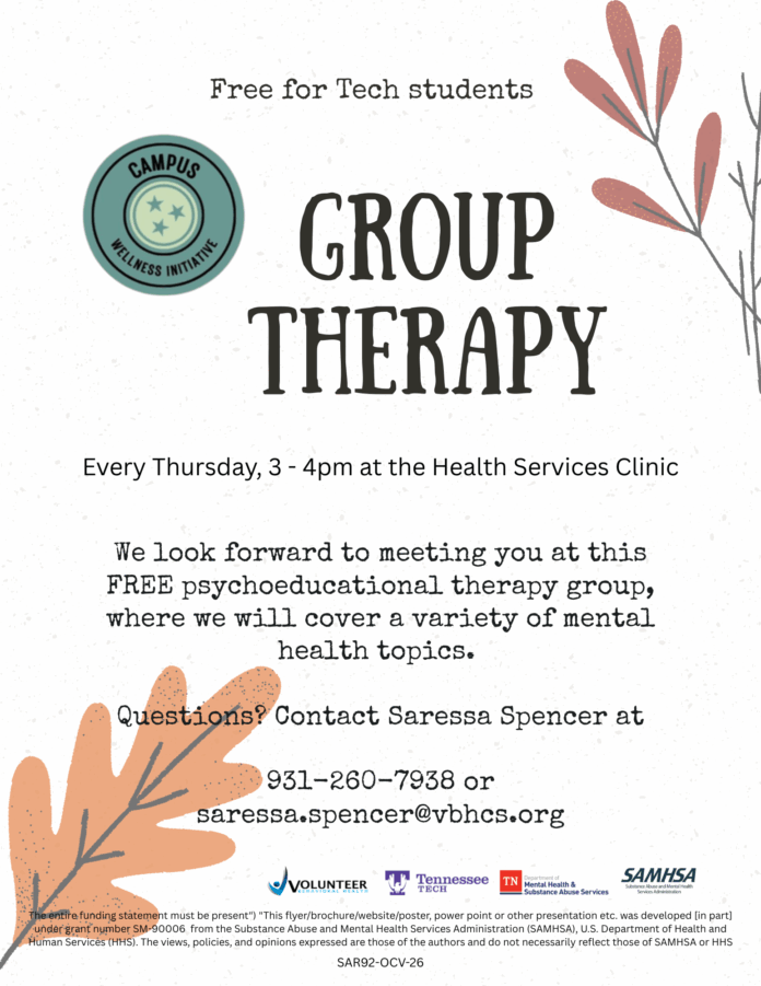 The Campus Wellness Initiative will host FREE psychoeducational therapeutic groups; every Thursday from 3PM to 4PM at the conference room of the Health Services Clinic, in Bell Hall. You can expect to learn about a variety of mental health topics such as anxiety, depression, grief, trauma, and more. We together can explore the best coping skills and stress management skills you need to have a great semester! For more information, contact Saressa Spencer at saressa.spencer@vbhcs.org or you can text/ call (931)-260-7938.