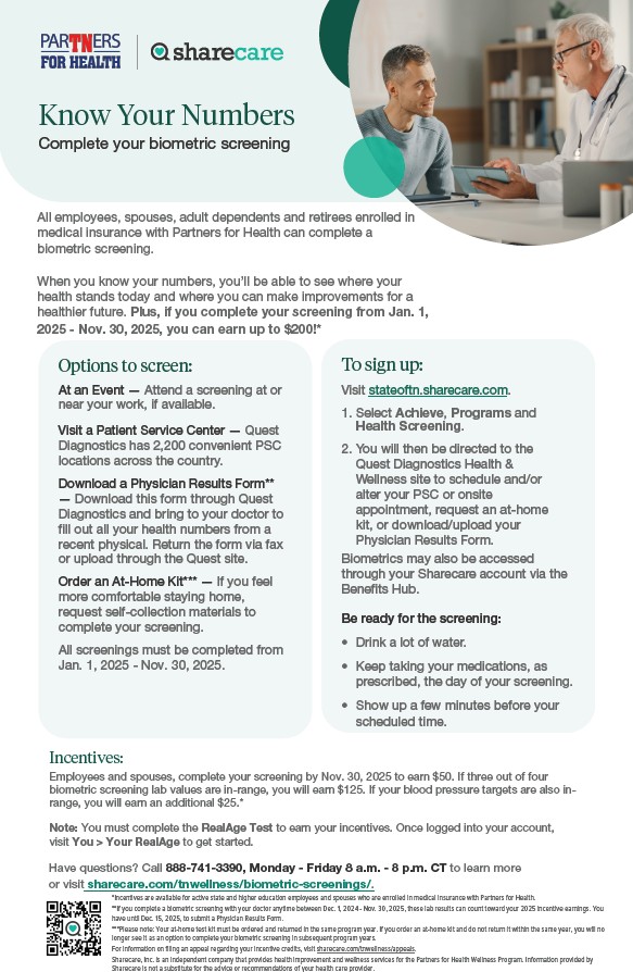 There is still time to register for our final 2025 biometric screening for employees, spouses and retirees, enrolled in medical insurance through Partners for Health. This event will take place, November 11, in the RUC Tech Pride Room 101, from 8am-12:30pm. Please see the attached screening flyer for registration and incentive information.  Complete the Real Age Test online to unlock your incentives before screening. Walk-ins slots may be available but are not guaranteed.  Click here for a printable 2025 Incentive Table showing all the ways enrolled higher ed members can earn cash incentives.  Questions? Please call Sharecare at 888-741-3390.