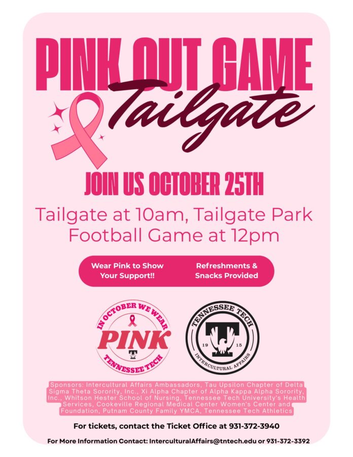 Join us on for the Pink Out Game and Tailgate, Saturday, Oct.25th as the Golden Eagles take on Southeast Missouri. We will honor breast cancer survivors and remember those who lost to this battle during the game. Survivors are invited to join the team for the Golden Eagle Walk at 9:30 a.m. and will need to arrive by 9 a.m. to the tailgate lot. For more information on participating in the Golden Eagle Walk or to get discounted tickets and any additional information, please email InterculturalAffairs@tntech.edu or call 931-372-3392. Free food, t-shirts, and fellowship! See you there!