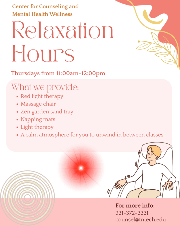The Center for Counseling and Mental Health Wellness are inviting you to stop by our Relaxation Hours Workshop! We want to provide you all a space to unwind and relax in between classes, no obligation or lecture involved – just a quiet, safe space to chill out! We have red light therapy, a massage chair, a sand tray, and more! We will be offering our relaxation space every Thursday this semester, starting at 11:00am. We are located on the 3rd floor of the RUC, so if you get a chance, please stop by! All students are welcome. Give us a call at 931-372-3331 for more info!