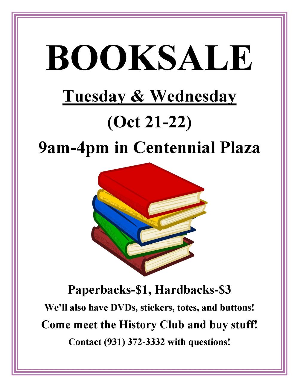 In case of rain, the book sale will be moved to Wednesday, October 29th and Thursday, October 30th. For questions, please contact the History Department at 931-372-3332.