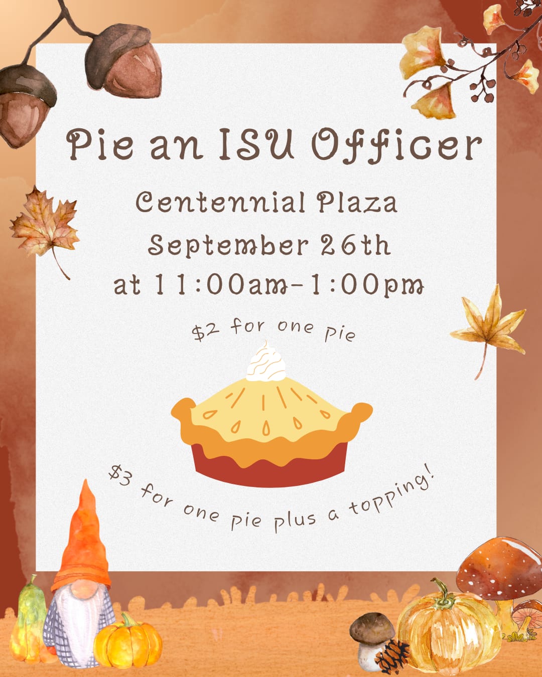 Join the International Student Union (ISU) on Friday, September 26 at Centennial Plaza from 11:00am to 1:00pm for our fun “Pie an ISU Officer” fundraiser! For just $2, you can pie an officer, or make it extra sweet with toppings for $3.