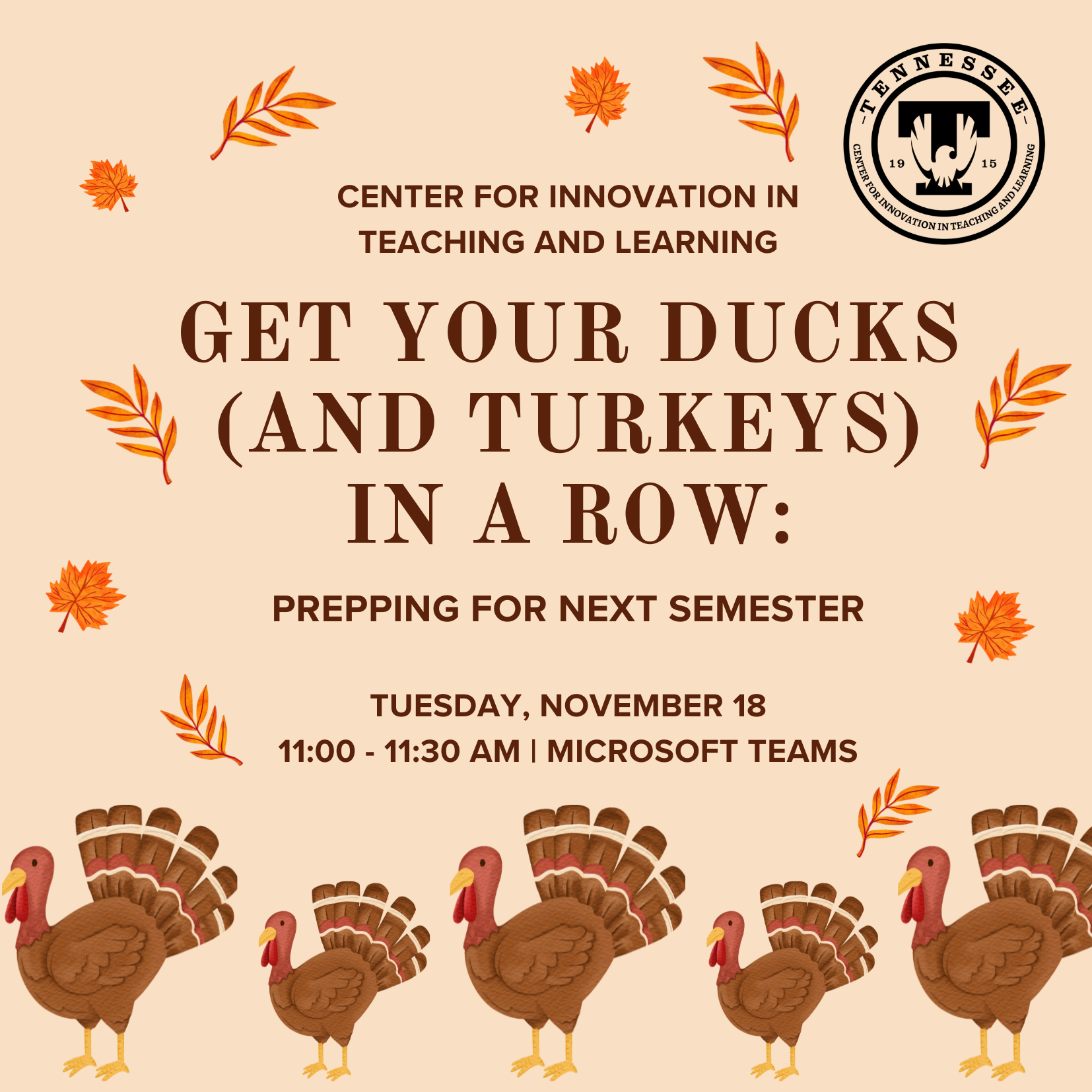 Before you head off for the holidays, join us on Tuesday, November 18th at 11 AM via Teams for a quick 30-minute session to get a head start on spring. In this CITL Tech Tuesday session, we’ll share quick ways to refresh your course materials, streamline navigation, and check for accessibility issues that impact students. Prep now so you can feast later—on both turkey and the satisfaction of a course that’s ready to go! Register here and contact citl@tntech.edu with questions.
