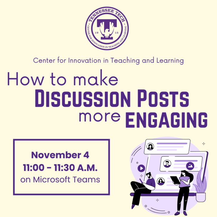 Want to boost student interaction in your online discussions? This session offers practical strategies to create compelling prompts, encourage meaningful responses, and use D2L tools to enhance engagement. You’ll leave with ready-to-use ideas and templates to energize your course discussions. Join us Tuesday, November 4th at 11 AM via Teams to learn more. Register here and contact citl@tntech.edu with questions.