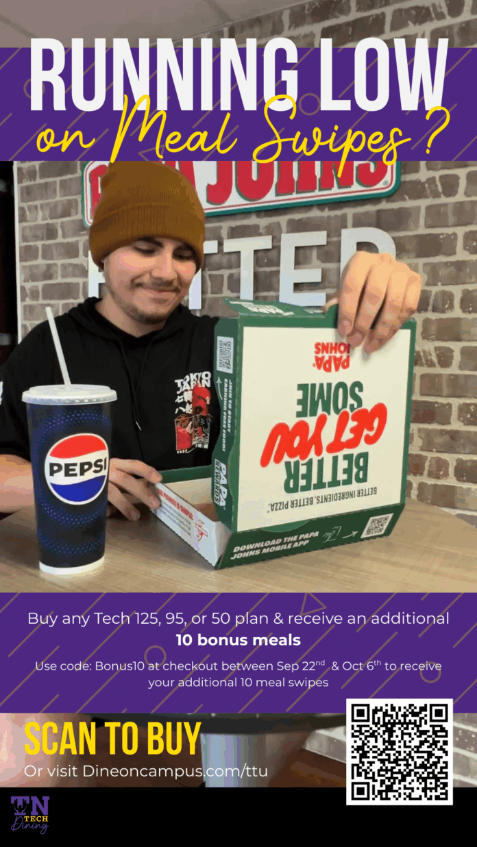 Head over to dineoncampus.com/ttu and use code Bonus10 at checkout to lock in your extra swipes.