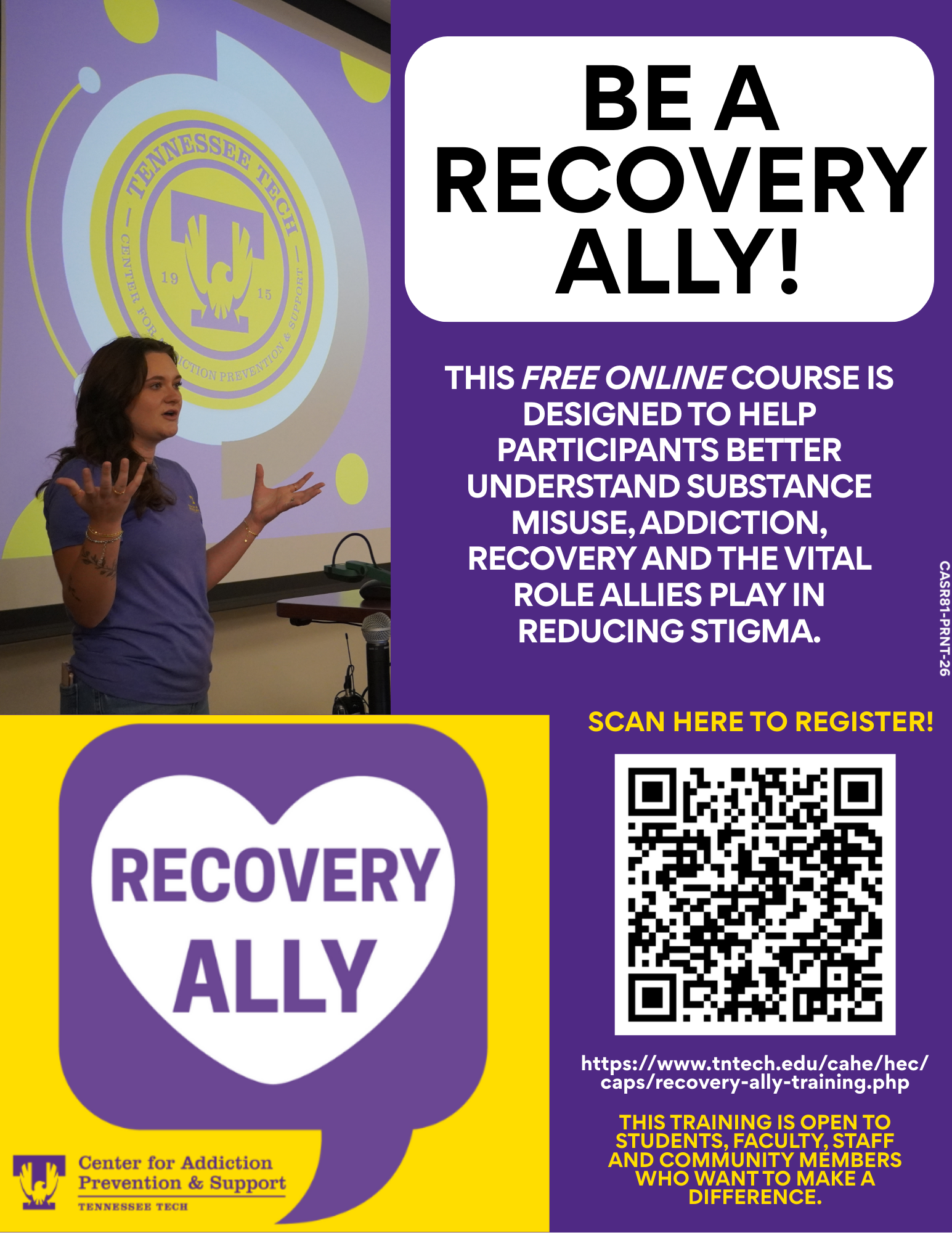 The Center for Addiction Prevention & Support is pleased to announce the launch of our Recovery Ally Training! This free online course is designed to help participants better understand substance misuse, addiction, recovery, and the vital role allies play in reducing stigma. The course is designed to be completed in one hour, but the learning modules can be completed at your preferred pace. It is open to anyone who wants to support the recovery community. Register here: https://www.tntech.edu/cahe/hec/caps/recovery-ally-training.php
