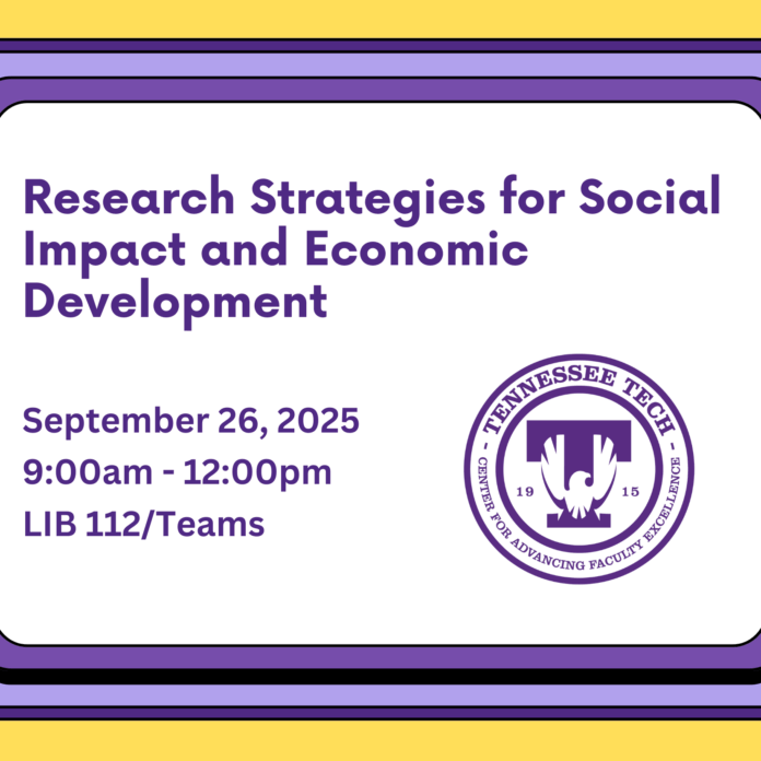 Register to attend the next session in our research workshop series, Research Strategies for Social Impact and Economic Development, on Friday, September 26th from 9:00 AM – 12:00 PM virtually or in person in LIB112. Explore how local and regional partnerships can drive research activity in Tennessee, benefiting both researchers and local communities. Gain insights into the history of economic development initiatives and their impact on the state’s innovation landscape. This session will also include a panel discussion from current grantees about their projects. Register here and contact cafe@tntech.edu with questions.