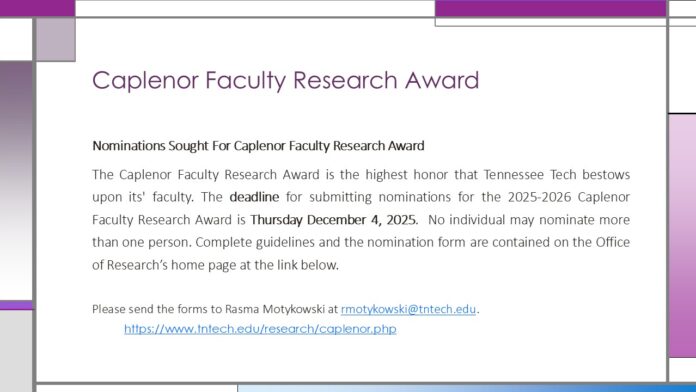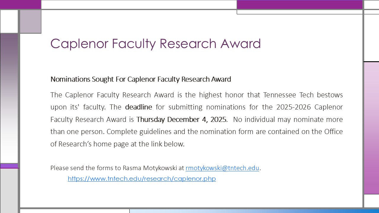 NOMINATIONS Sought for Caplenor Faculty Research Award. The Highest Honor that Tennessee Tech bestows upon its faculty. Please submit nominations by Thursday, Dec. 4, 202,5, to RMotykowski@tntech.edu Learn more..
