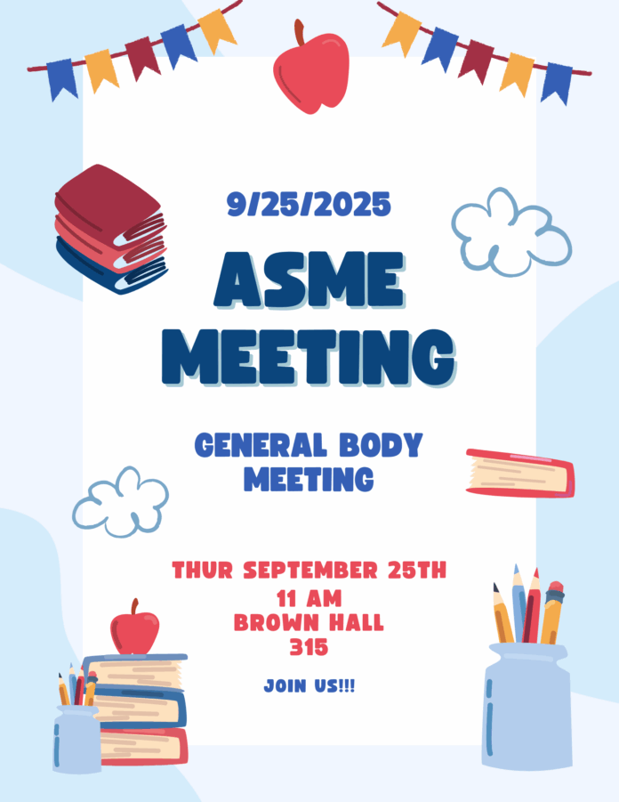 ASME General Body Meeting 86 FacebookTwitterPinterestWhatsApp Join TN Tech’s ASME Student Section at our next meeting on Thursday September 25th in Brown Hall 315 as we discuss some housekeeping things and future events for the club!
