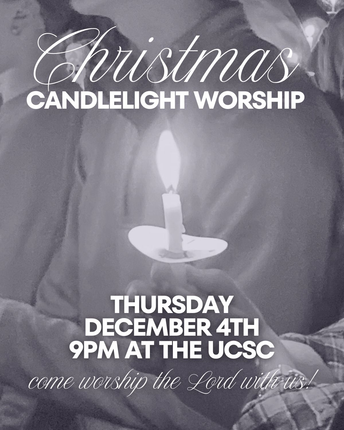 Join UCSC for our annual candlelight worship on December 4th at 9 PM. It will be a traditional night of worship with advent candles. The service will be held at Collegeside Church of Christ in our small auditorium. Feel free to meet at UCSC a little before and we can all walk over together!!