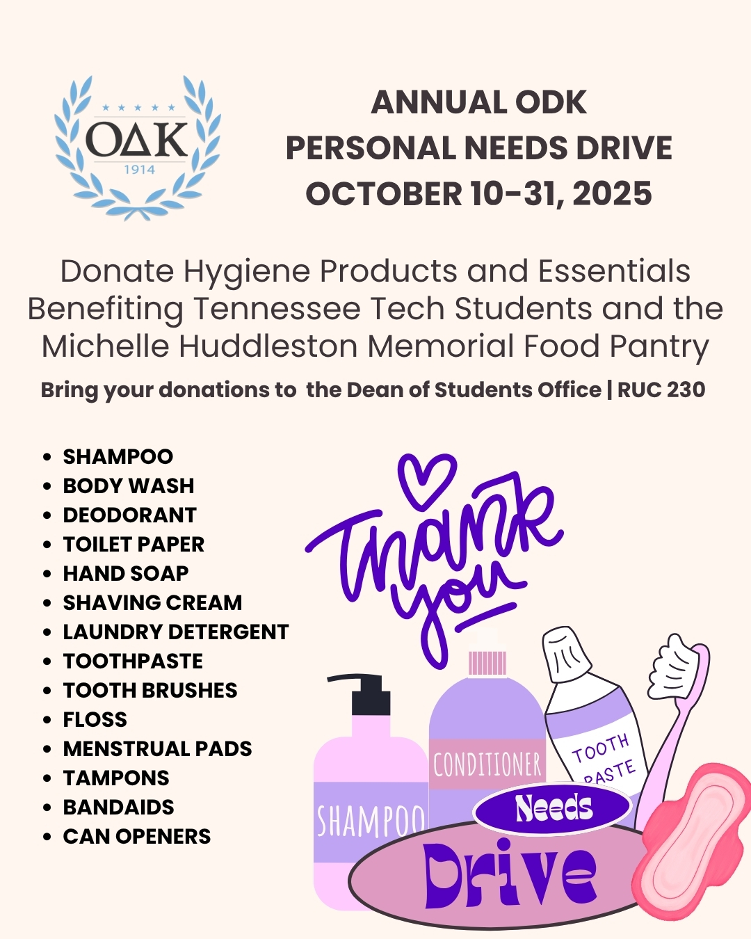 Omicron Delta Kappa (ODK) is hosting its Annual Personal Needs Drive benefiting Tennessee Tech students and the Michelle Huddleston Memorial Food Pantry. Bring your donations to RUC 230 from October 10 to 31, 2025. Items needed include: shampoo, feminine products, can openers, TP, oral care products, and more.