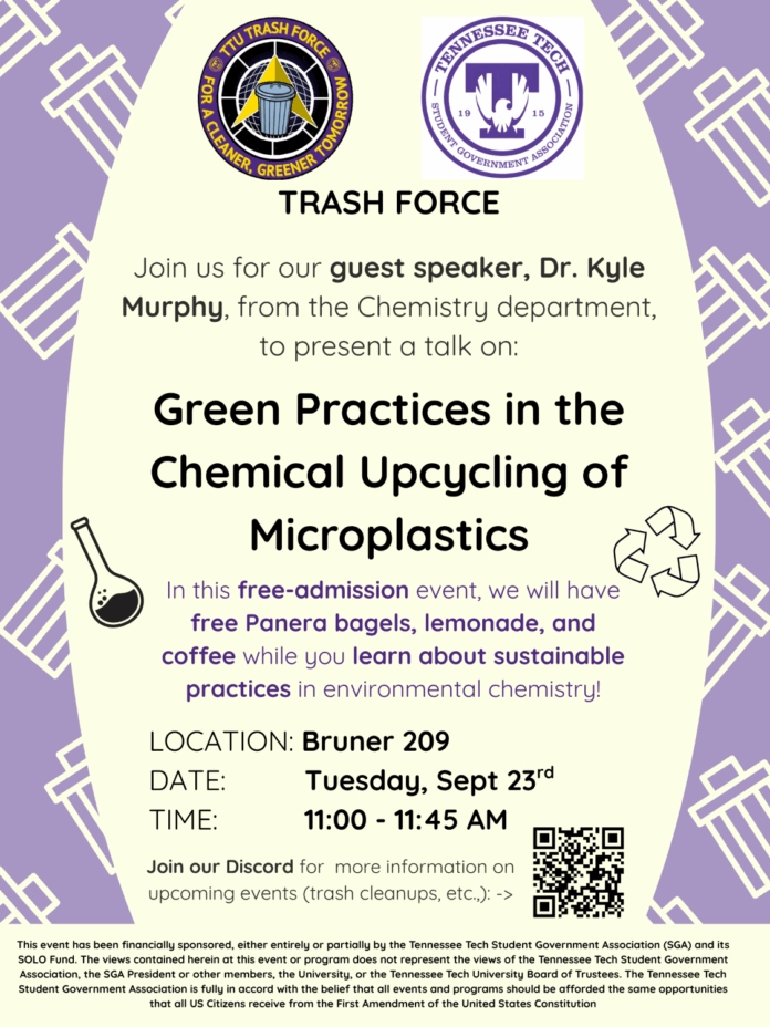 Join Trash Force in learning more about environmental chemistry from Dr. Murphy of the Chemistry department! He will be giving a presentation on “Green Practices in the Chemical Upcycling of Microplastics”! Topics include: background of microplastic issue in TN, green chemistry/doing research in labs, “green chemicals” (chemicals which will be used to break down microplastics and upcycling the components into new plastics), and future plans/other plastic work on-going in the chemistry department. Panera bagels, tea, lemonade, and coffee will be provided for those in attendance.