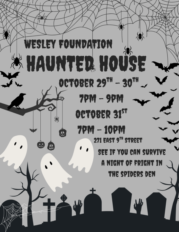 Wesley Foundation Haunted House 57 FacebookTwitterPinterestWhatsApp Wesley Foundation is hosting their annual haunted house! It is open October 29th-30th from 7-9pm and October 31st from 7-10pm. 221 East 9th Street