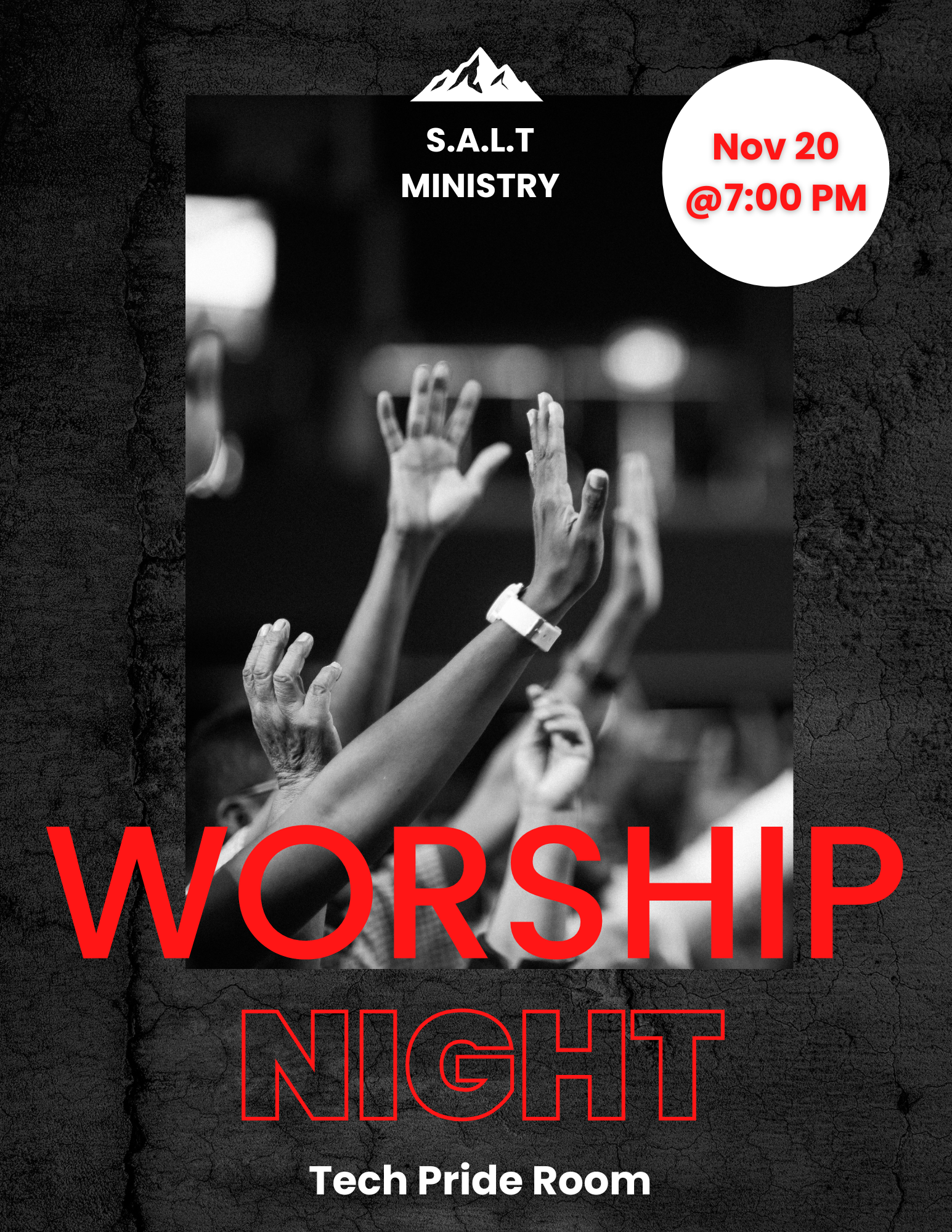 TNTech’s S.A.L.T Campus Ministry group will be hosting a worship night in the Tech Pride Room, right next to the Caf, of Roaden University Center on Thursday, November 20th at 7PM. We will be singing songs of worship and giving testimonies of praise to Jesus and encouragement to one another. Come join us for a time of rest and refreshing as we worship the Lord and pray for the health and revival of hope on our campus!