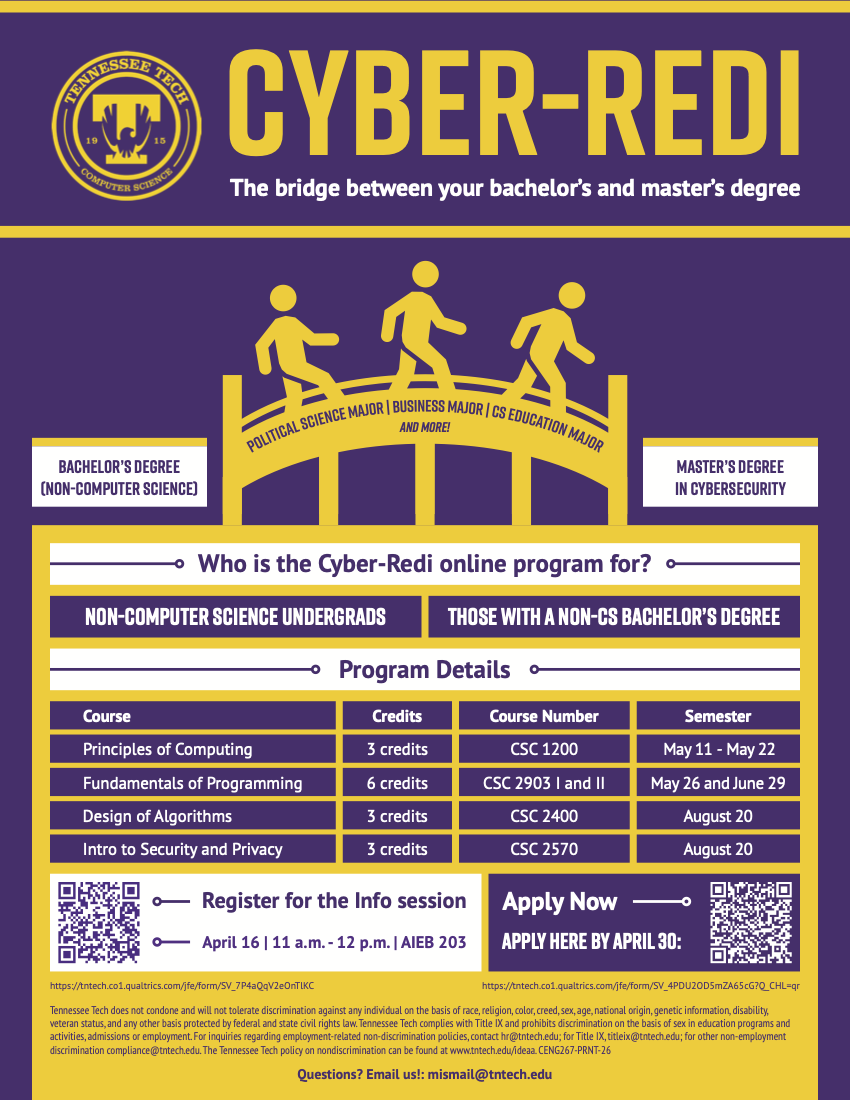 Interested in a cybersecurity career but don’t have a computer science background? Tennessee Tech’s Department of Computer Science is launching an online Cyber-Redi bridge program for non-computer science majors (current students and graduates) to pursue a master’s in cybersecurity. Register here to attend an info session (in-person or virtual) April 16 at 11 a.m. in AIEB 203. Apply here for the Cyber-Redi program by April 30. For more details, contact Dr. Muhammad Ismail at mismail@tntech.edu.