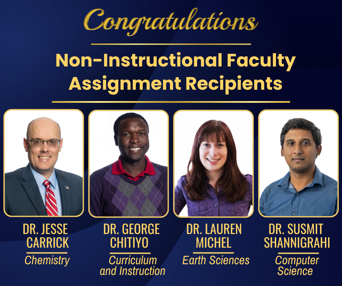 Congratulations Dr. Jesse Carrick (Chemistry), Dr. George Chitiyo (Curriculum and Instruction), Dr. Lauren Michel (Earth Sciences) and Dr. Susmit Shannigrahi (Computer Science), recipients of 2026-2027 Non-Instructional Faculty Assignments!