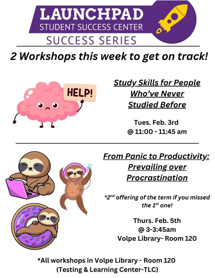 Don’t let the spring semester start rough like the weather! We have 2 workshops this week to help you brave the semester. The Launchpad Student Success Center, in partnership with the Testing & Learning Center (Volpe Room 120) will host the following: