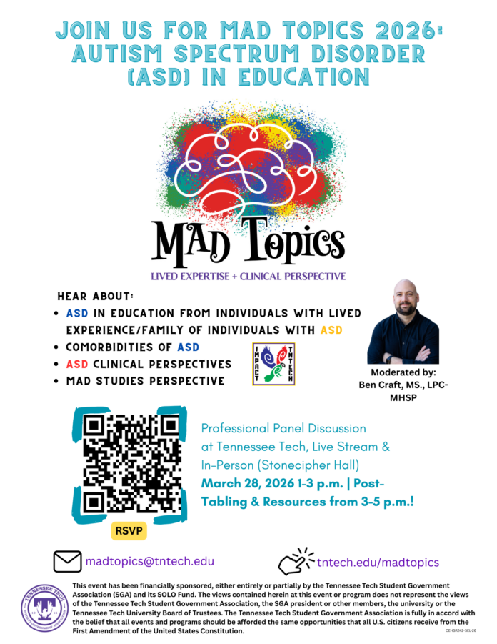 Join us for the 2026 Mad Topics Symposium Panel at 3:00 p.m., Saturday, Mar. 28 in Stonecipher Hall 126. This panel explores Autism Spectrum Disorder through the lens of clinical expertise and lived experience.