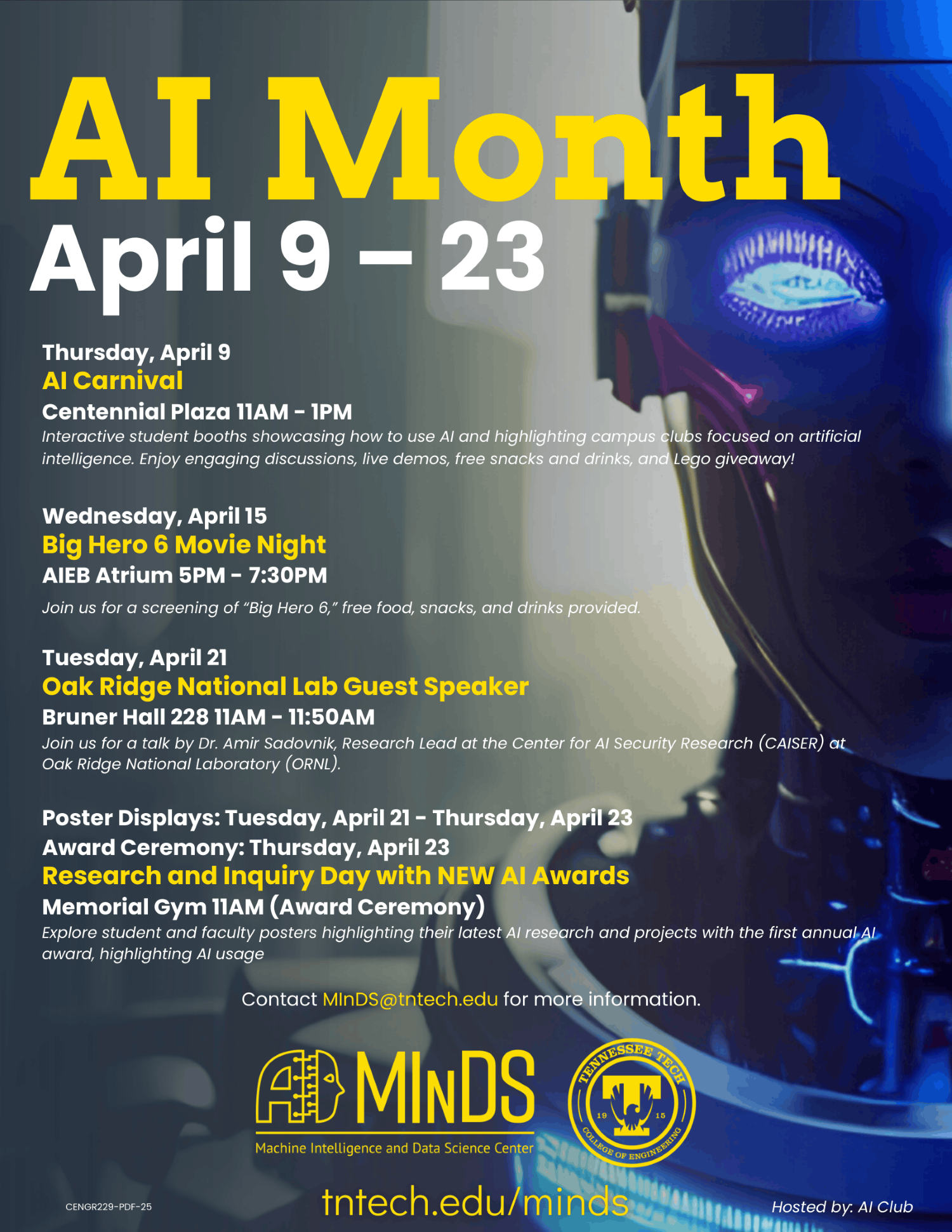 April marks Tennessee Tech’s second AI Month! Join us for the AI Carnival for various booths filled with AI activities and made by Tech students for free! If you visit enough booths, you can enter in a giveaway for a Lego Bonsai! Stop by Thursday, April 9th 11 a.m. – 1 p.m. on Centennial Plaza!