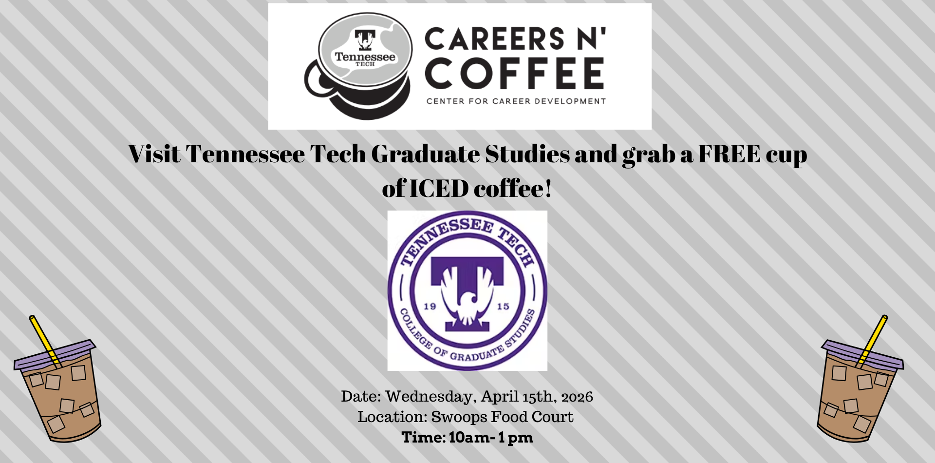 Take a break and enjoy a FREE cup of coffee while speaking with Tennessee Tech’s College of Graduate Studies on Wed, April 15, at 10 a.m. in the RUC’s Swoops Food Court.