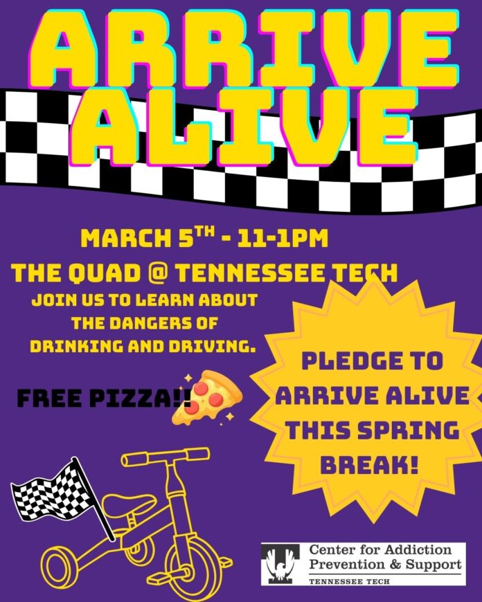 The Center for Addiction Prevention & Support will host Arrive Alive from 11 a.m. to 1 p.m. on Thursday, March 5 on the main quad.