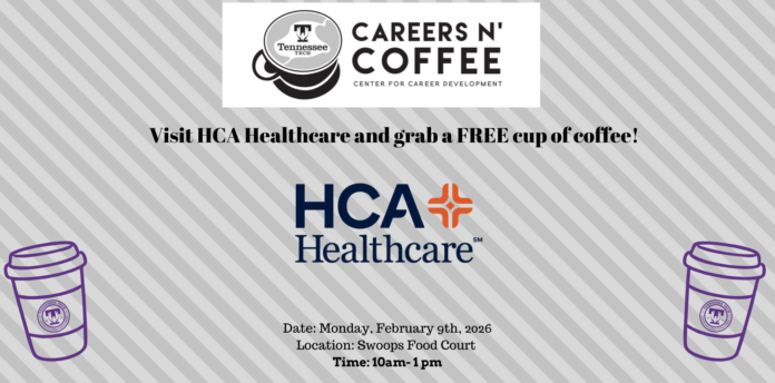 Take a break and enjoy a FREE cup of coffee while speaking with recruiters from HCA Healthcare on Mon, Feb. 9, at 10 a.m. in the RUC’s Swoops Food Court.