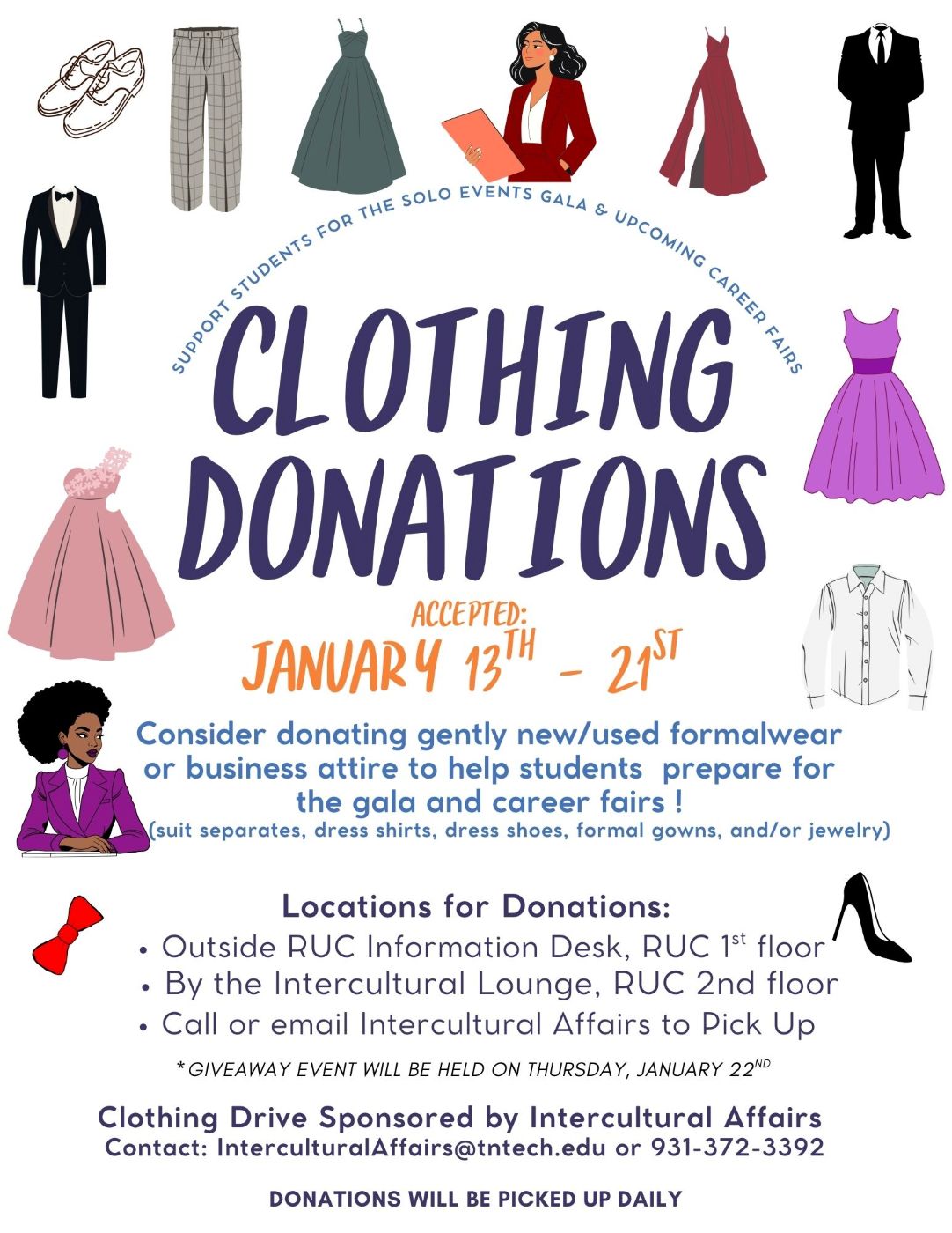 We invite the TTU community to contribute to our Clothing Giveaway Drive by donating gently used professional attire. The purpose of this event is to provide our students with professional attire for career opportunities and special occasions. Donations can be dropped off at the Intercultural Affairs office in Roaden University Center (RUC 258) or at the designated locations on the attached flyer until the afternoon of January 21st. For donation pickups or questions, please contact us at 931-372-3392 or Interculturalaffairs@tntech.edu. This event is sponsored by the Intercultural Affairs office. Let’s come together and make a difference!