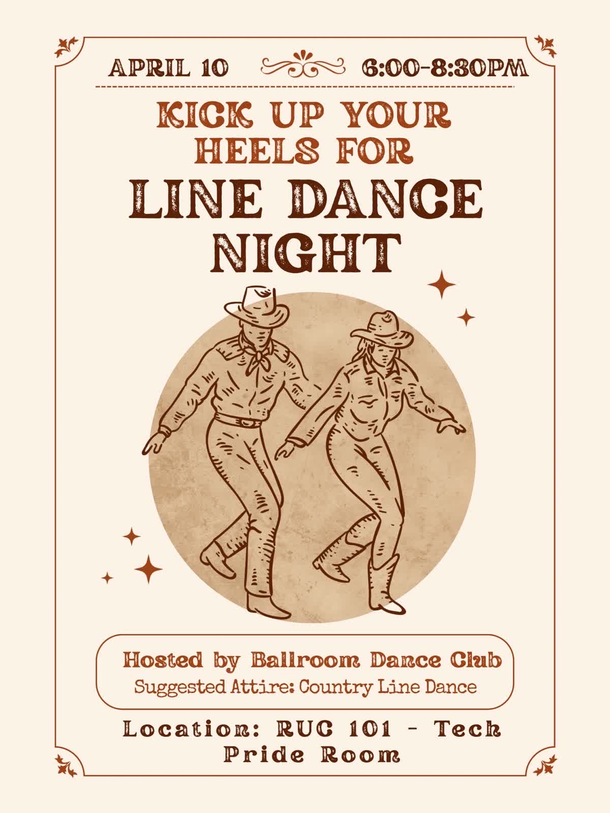 Come learn Line Dancing with the Ballroom Dance Club! 9 FacebookXPinterestWhatsApp Come learn Line Dancing with the Ballroom Dance Club! This event is from 6 p.m. to 8:30 p.m., Friday, April 10, in RUC 101 (Tech Pride Room). No experience needed! Country getups recommended, not required!