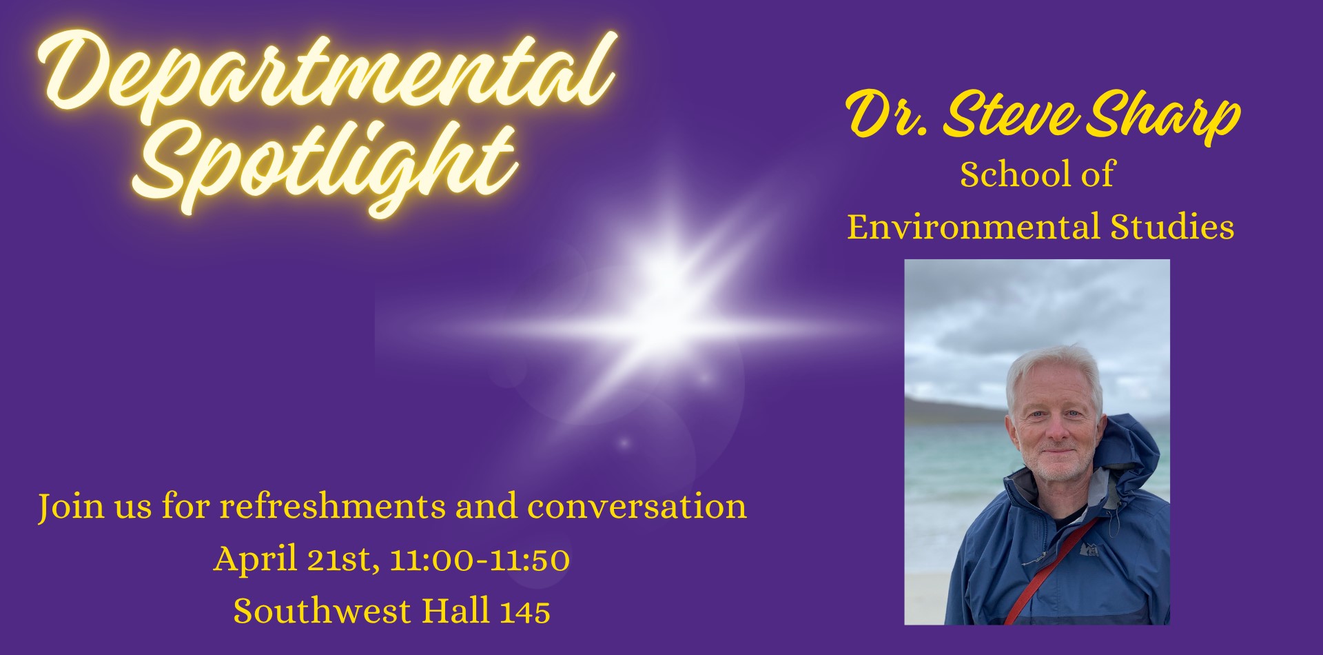 Join Dr. Steve Sharp for a departmental spotlight hosted by the School of Environmental Studies on Tuesday, April 21, at 11 amĀ in Southwest Hall 145. A light lunch will be provided, and all students and faculty are encouraged to attend. No RSVP is required.