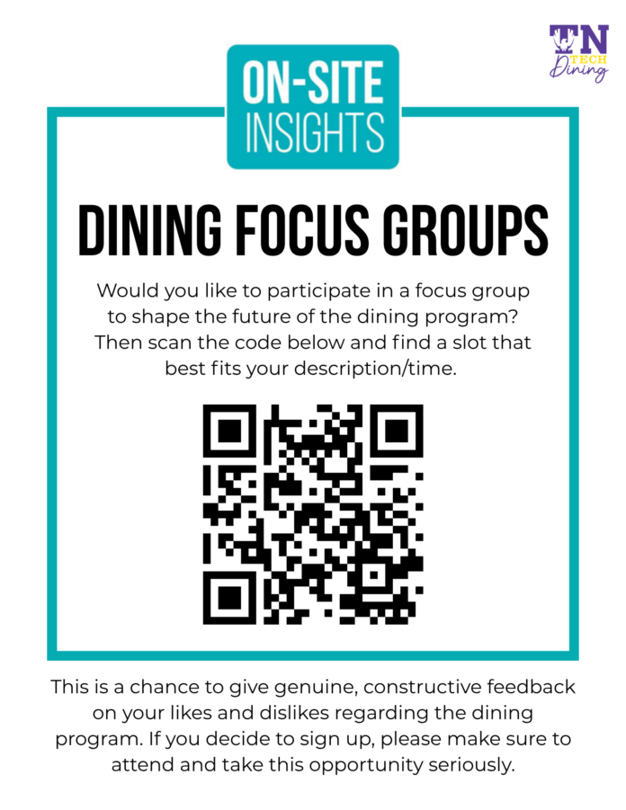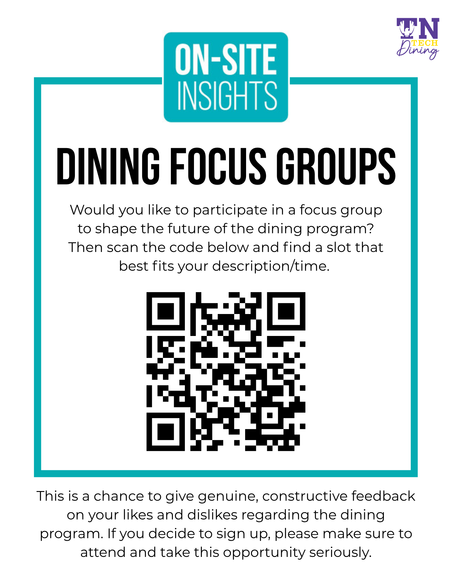 Campus Dining values your feedback and invites you to join an “On-Site Insights” focus group to share your dining experiences. Sessions are 45 minutes, confidential, and include complimentary food. Space is limited to 15 participants per session. As a thank-you, you’ll receive $25 dining dollars and 3 Caf entry tickets. Your input will help shape the future of campus dining. Click here or scan the code to sign up! Faculty & Staff are welcome.