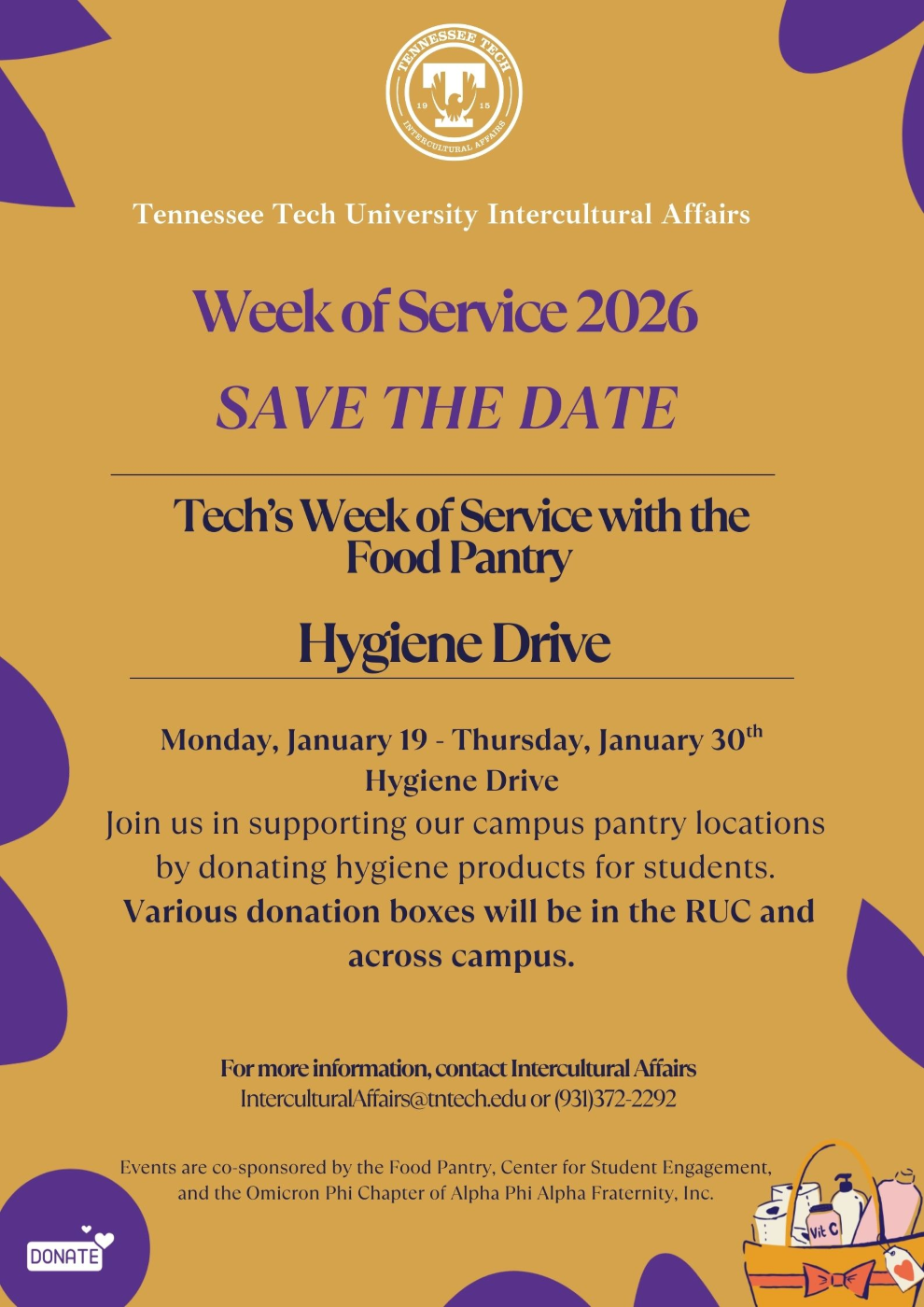 Happy New Year, everyone! We’re thrilled to kick off our annual Hygiene Drive for the Food Pantry from Jan 19th to 30th. Please consider donating new, unopened hygiene items. Collection boxes will be set up in the Roaden University Center (RUC) and other campus spots. Your generosity makes a huge difference! Stay tuned for more info. Thank you for your support! This event is sponsored by the Intercultural Affairs and the TTU Food Pantry. For more information, contact InterculturalAffairs@tntech.edu or 931-372-3392