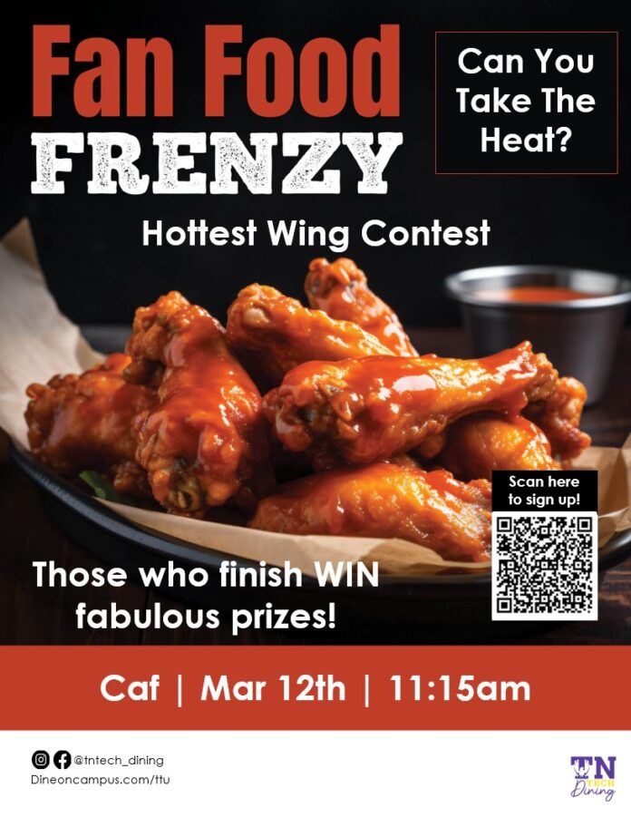 Think you can handle the heat? Join Fan Food Frenzy, our spicy wing eating contest, on March 12 at 11:15am in the Caf. Only the bravest will win a prize! Participation is limited to 10 contestants, so sign up through the QR code or the link on our social media @TNTech_Dining. Come watch the action!