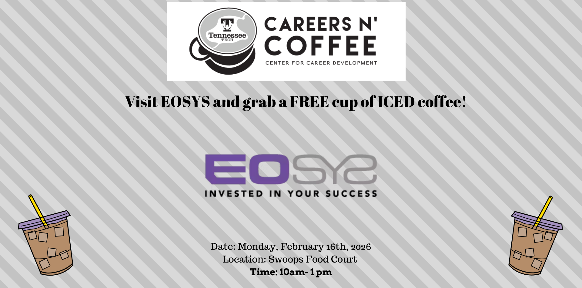 Take a break and enjoy a FREE cup of coffee while speaking with recruiters from EOSYS on Wed, Jan. 16, at 10 a.m. in the RUC’s Swoops Food Court.