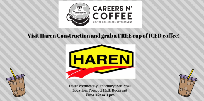 Take a break and enjoy a FREE cup of coffee while speaking with recruiters from Haren Construction on Wed, Feb. 18, at 10 a.m. in Prescott Hall, Room 216.