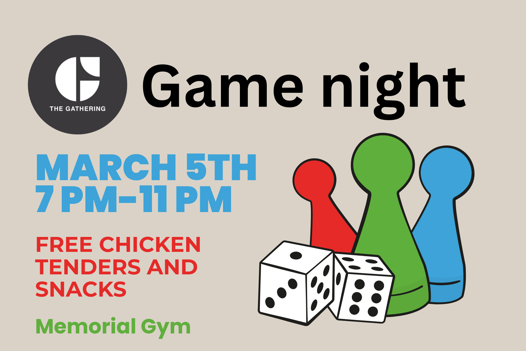 Gathering Game Night 23 FacebookXPinterestWhatsApp Join the Gathering in Memorial Gym on March 5th from 7pm-11pm for some free food and board games! We would love to see you there!