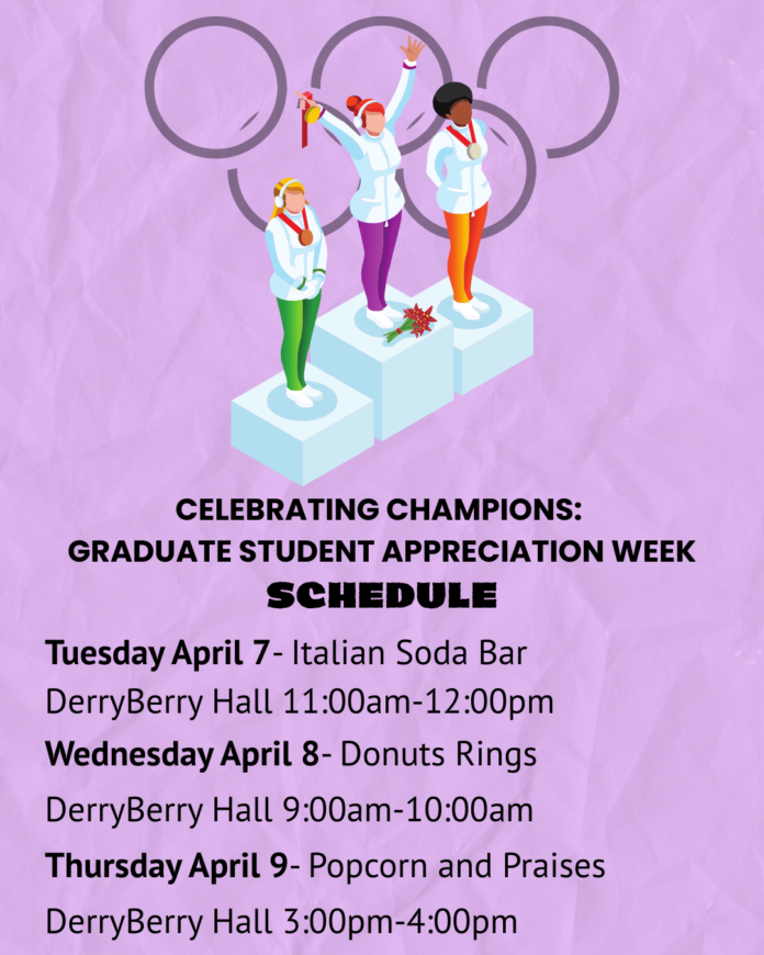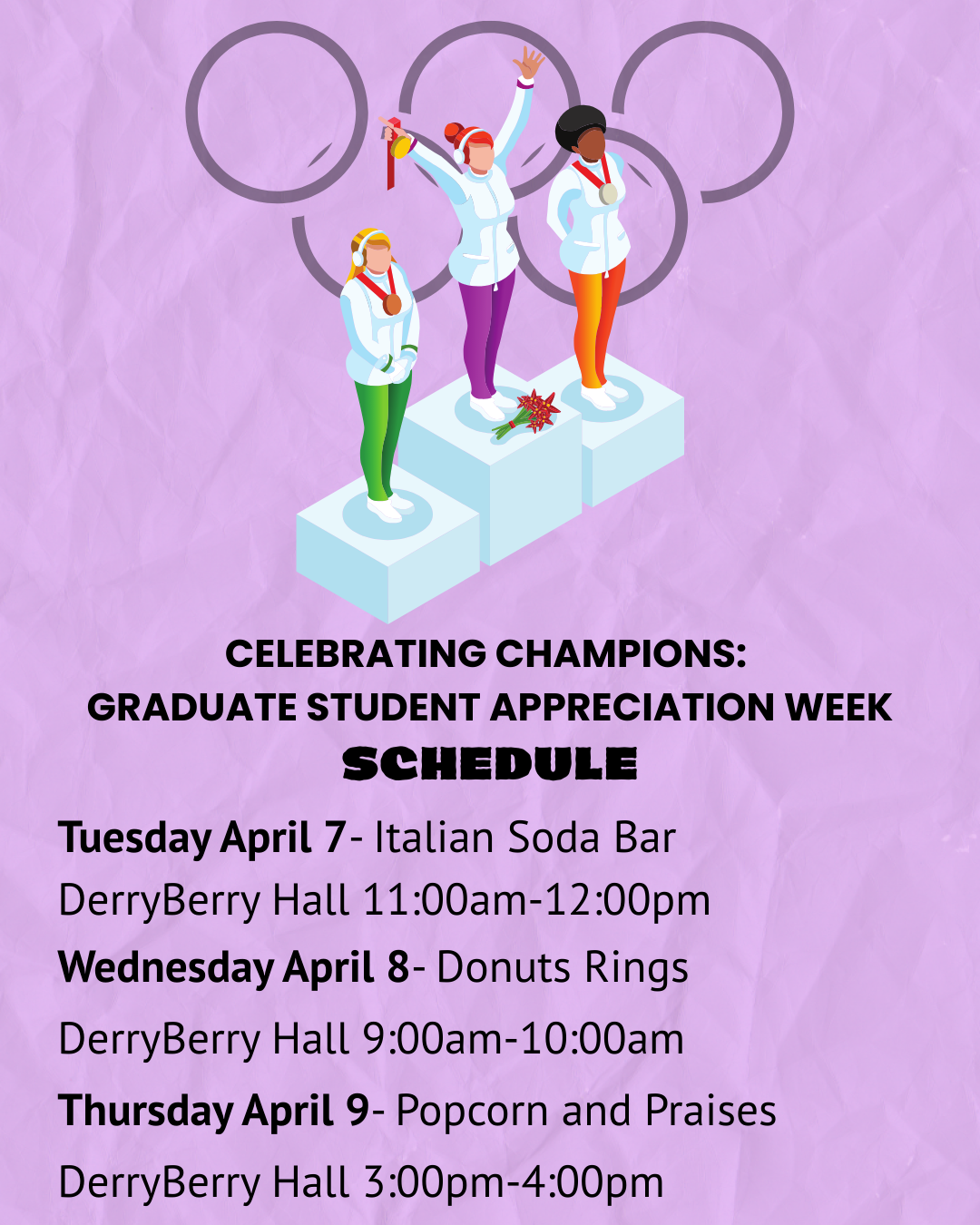 To honor our TN Tech graduate students, the College of Graduate Studies invites all graduate students to attend our exciting events that will be held on the 2nd floor of Derryberry Hall during that week. Events include Italian Soda Bar at 11am on the 7th;coffee and donuts at 9:00 AM on the 8th; and Popcorn and Praises at 3:00 on the 9th.